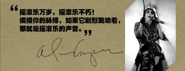 比抹着一脸白垩粉画着标志性黑眼圈更让我喜欢的,是艾丽斯·库珀对摇滚乐下的定义——“摸摸你的脉搏,如果它剧烈跳动着,那就是摇滚乐的声音。”是啊,与其说摇滚是一种音乐类型,倒不如说摇滚是一种生命本能。