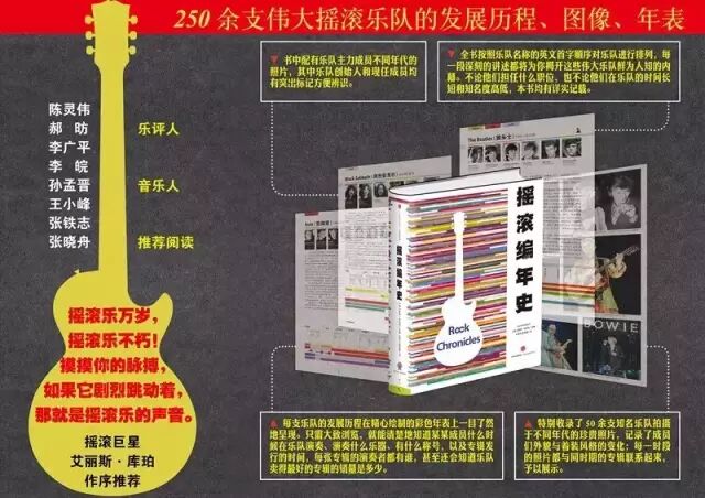 这本书的主编是英国流行音乐资深研究者戴维·罗伯茨,既然书名为“编年史”,此君的野心显然不仅仅在提供无敌资料上,而是以时间为经,以一张纸经典专辑以及一个个乐坛重大事件为纬,突出地标识并立起一支支殿堂级乐队以及一个个伟大的音乐人。在乐队的体现上,本书也以类似纪传体的编排,织出了一张众星熠熠的摇滚光谱。虽乐队与乐队之间着墨不同,有的千余字,有的则只有几百字,但特写镜头式的语言、鲜为人知的乐坛轶事与振聋发聩的时代之声,无论文字长短,都叫人回味深长。