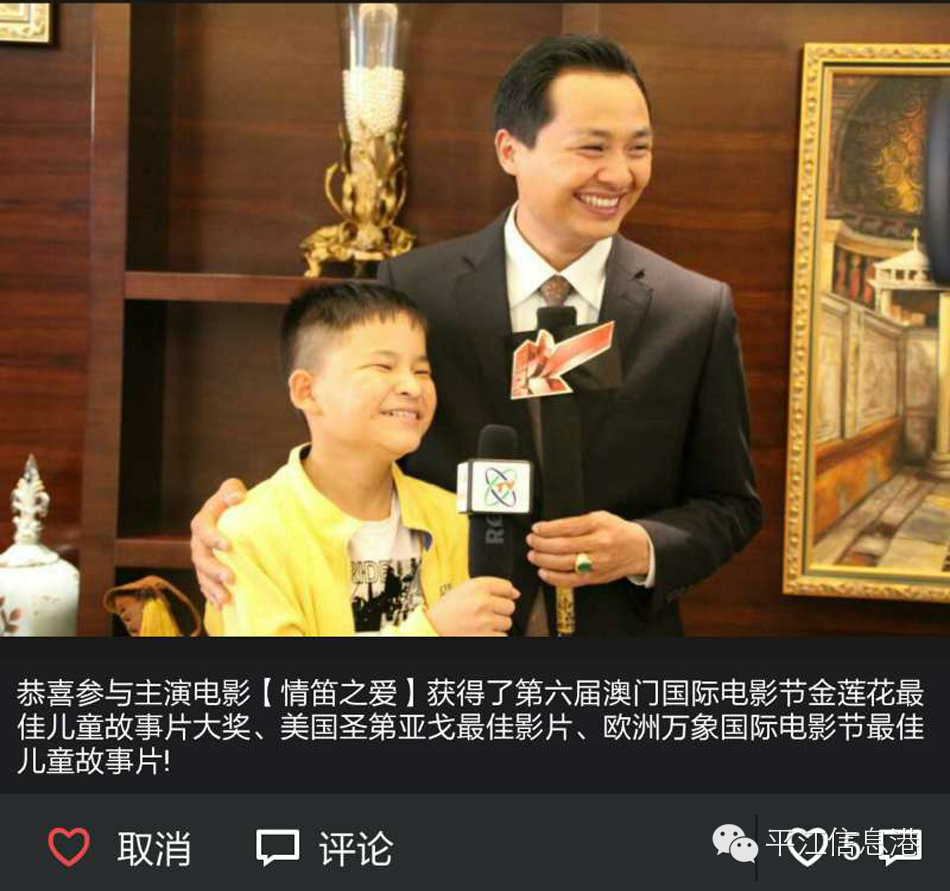 近日,文祥微信朋友圈发出一条微信:“恭喜参与主演电影【情笛之爱】获得了第六届电影节金莲花最佳儿童故事片大奖、美国圣第亚戈最佳影片、欧洲万象国际电影节最佳儿童故事片!”。在这里,小编作为一个平江人也为文祥身感自豪,也期待文祥2015能有更多精彩的影片上映...