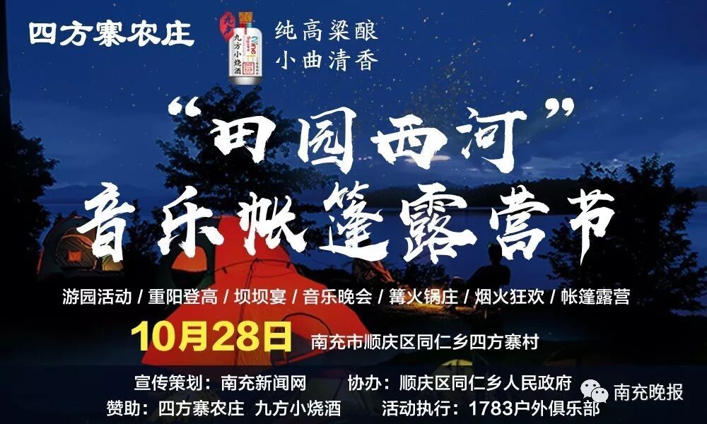 由顺庆区同仁乡人民政府主办,四方寨农庄以及九方小烧酒提供全程赞助,南充新闻网宣传策划、1783户外俱乐部承办的首届“田园西河”帐篷音乐露营节将于10月28日在顺庆区同仁乡四方寨盛大启幕。届时,将有约500名户外爱好者齐聚一堂,共享这场户外音乐盛宴。