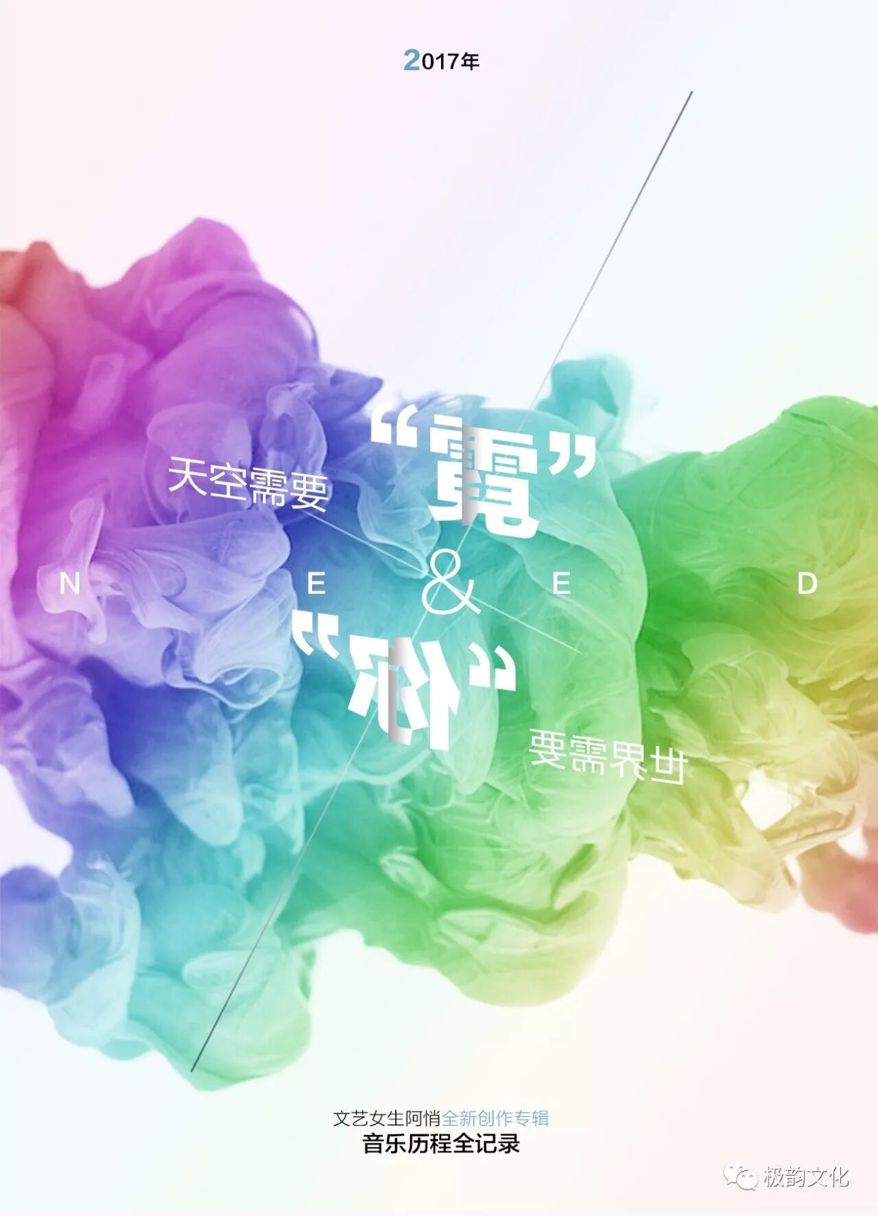 今年10月,阿悄出了一张新专辑,名字叫《霓NEED》,并举办了发布会。这张专辑的名字很特别,阿悄解释说,那是因为她有一次在雨后看到彩虹,那一天,几乎每个人都在朋友圈里刷图,而只有阿悄看到,彩虹边上,有一道微弱的七彩光线。她觉得很奇怪,就去查资料,发现这道不起眼的光线,叫做“霓”,它是太阳光进入小水滴里,经过两次折射和两次反射形成的,呈一道色彩圆弧,它的颜色排列与虹相反,色彩要比虹淡一些,也称副虹。她看完之后,产生了一些感悟,她觉得霓虽然没有虹艳丽惹眼,却总是温暖而隐忍地存在着,这不就像是世界上大多数人的生活吗,虽然没有主角般耀眼的光芒,但仍然坚守着内心的信仰,追寻着自己的梦想,寻找着自己存在的价值。