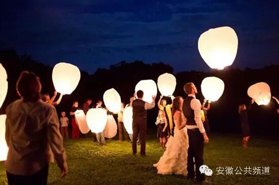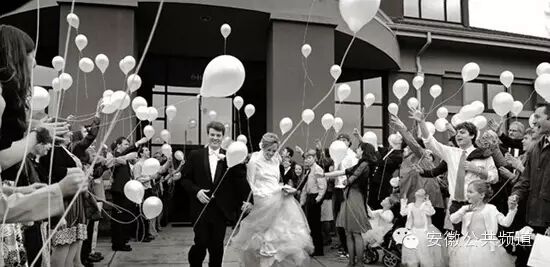 新人们和宾客们一起手中一起放落手中的氢气球,新人一起跑出会场。气氛达到最顶峰。