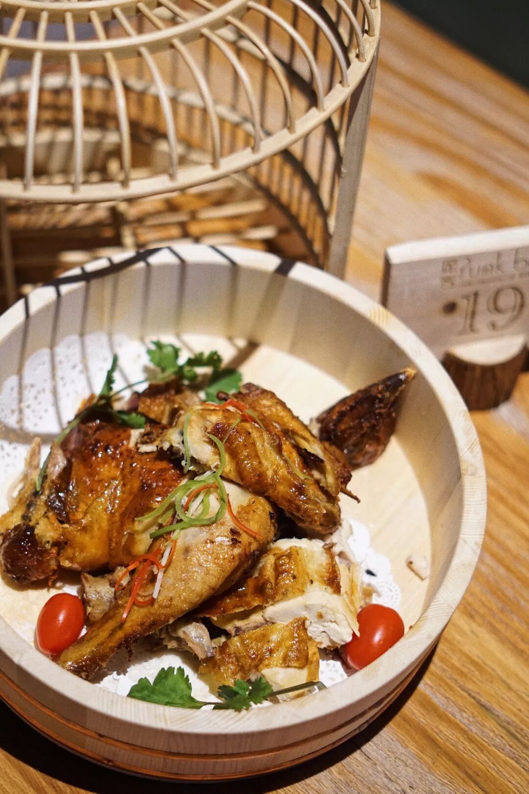 鸡肉金黄的外皮烤制焦酥,肉质细嫩多汁。一边吃着鸡肉一边搭配着特色酒水,惬意的很。
