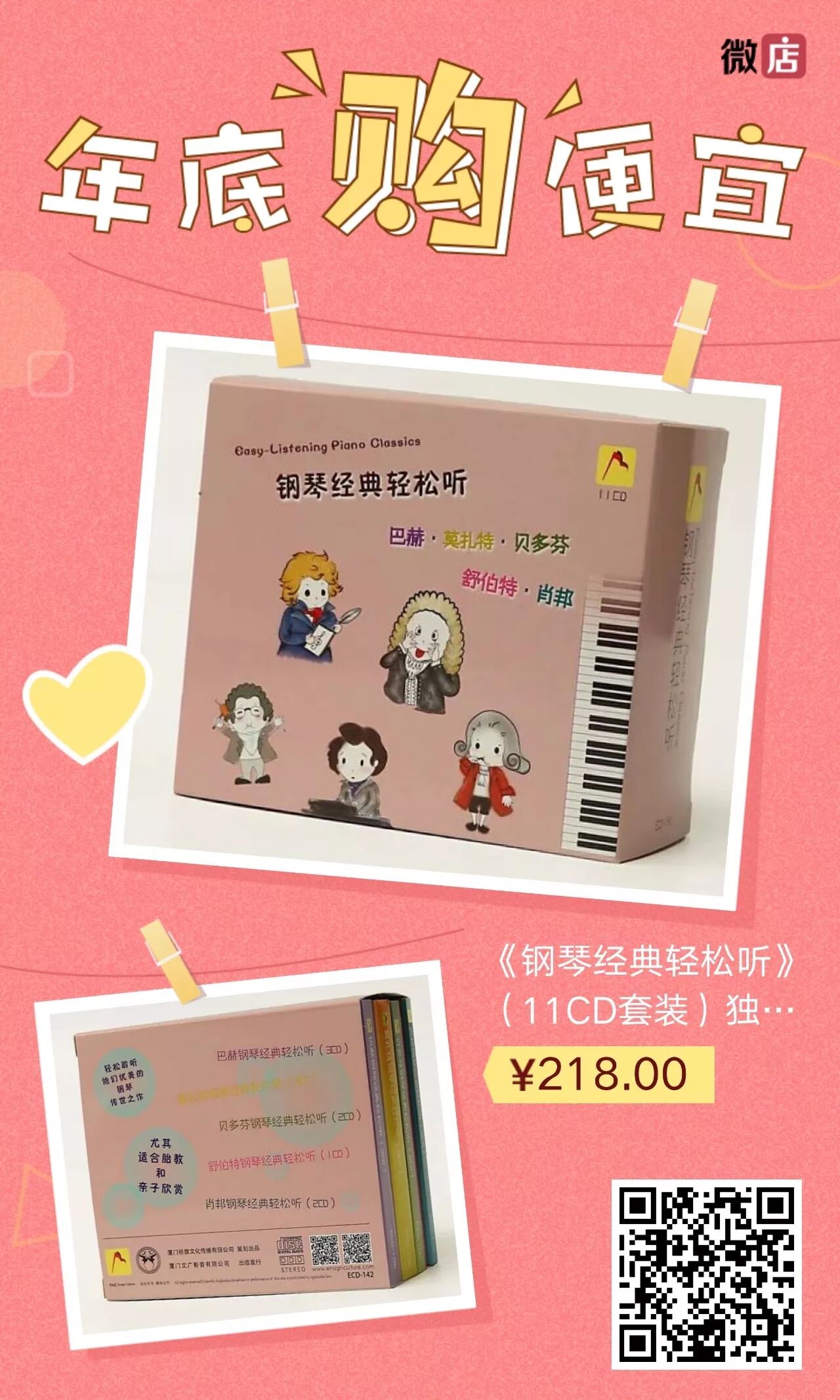 扫描下图中的产品二维码,进入咱们自己的小店购买,前120名下单购买本套《钢琴经典轻松听》的朋友,还可获得精美礼品赠送哦!小店里还有更多精选儿童音乐绘本、音像制品等教辅,欢迎大家选购哦!