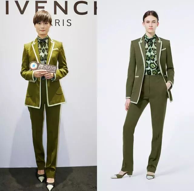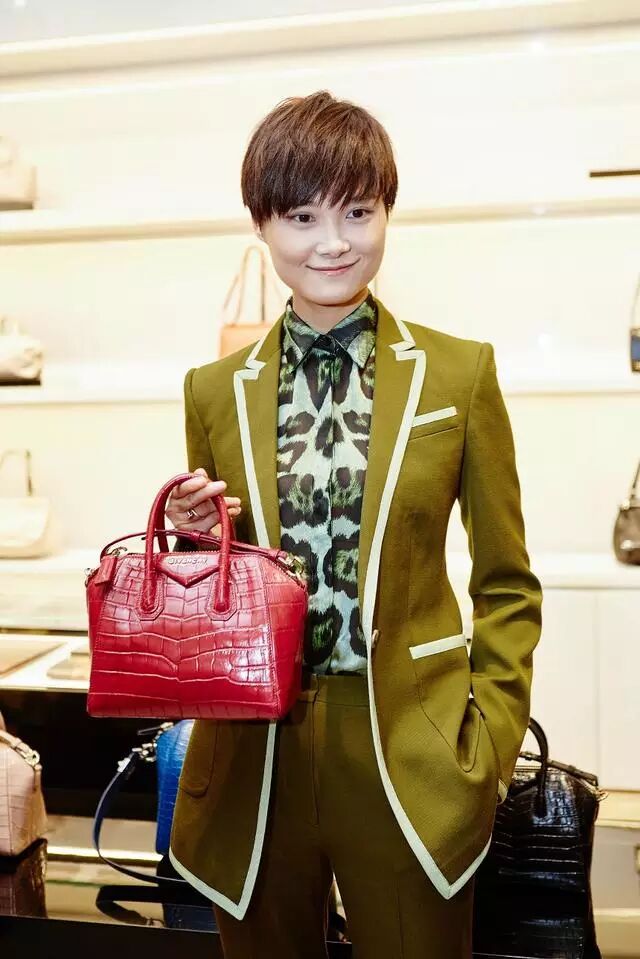 2015年10月16日,纪梵希深圳万象城精品店经重新设计装修后于商场一层中庭全新盛装开业,李宇春身着纪梵希2016早春系列女装出席。浅绿色包边装饰西装外套搭配绿色豹纹印花装饰衬衣,衬托出春春干净、白皙的面容;绿色西装长裤及绿色拼接高跟鞋,简约中不乏摩登感,透露出都市女性的时尚与干练。