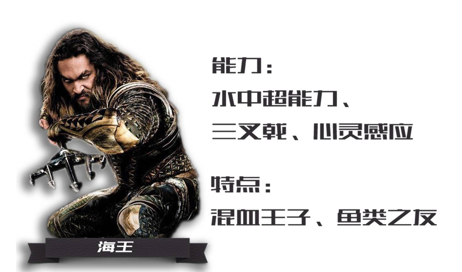 海王(Aquaman)亚瑟·库瑞拥有半人类、半亚特兰蒂斯人的血统,拥有超常人的体能、以及能在水下自由活动与呼吸、并有和海洋生物沟通的能力。