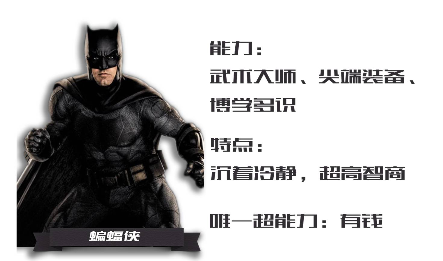 蝙蝠侠(Batman)本名布鲁斯·韦恩(Bruce Wayne),出生在高谭市最富有的家族“韦恩家族”里,被观众们成为“老爷”。
