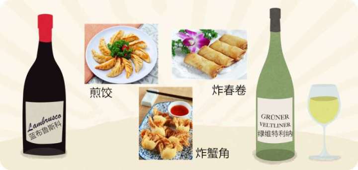 如果你喜欢油炸的开胃菜,不妨开一瓶绿维特利纳(Gruner Veltliner)葡萄酒或蓝布鲁斯科(Lambrusco)葡萄酒。没有一款酒像绿维特利纳葡萄酒一样能净化口腔中炸蟹角、煎饺和炸春卷留下的味道。酒中突出的矿物质、活泼的酸度、轻微的柑橘风味和较低的酒精度使这款酒喝起来十分清新,此酒可以搭配的食物范围很广。