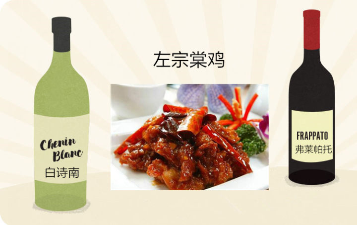 如果你爱吃左宗棠鸡这道菜,那选择白诗南(Chenin Blanc)葡萄酒或弗莱帕托(Frappato)葡萄酒准没错!白诗南葡萄酒一般是半干型的,酸度高,口感带有油质感,与中国菜简直是天造地设的一对。酒中清新的酸度可以平衡油炸之后再用酱汁调味的重口味菜式,如左宗棠鸡和陈皮鸡,酒中的果味也可以缓解香料带来的灼热感。同时,白诗南葡萄酒的风味可以使海鲜沙司和烤鸭酱中经典的酸甜汁味道更加突出。