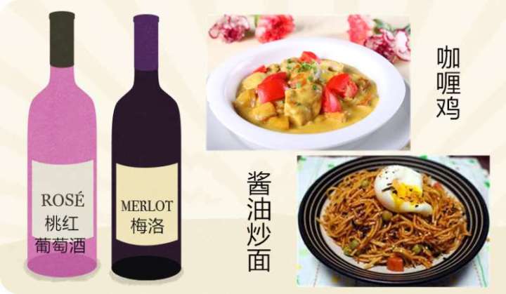 如果你点的是美味的炒菜,毋容置疑桃红葡萄酒或者梅洛(Merlot)葡萄酒会是最好的选择。桃红葡萄酒的颜色和风味非常丰富,带有橙、草莓和矿物质的风味,与鲜美的咖喱鸡或酱油炒面一同享用更能突显菜肴的美味。