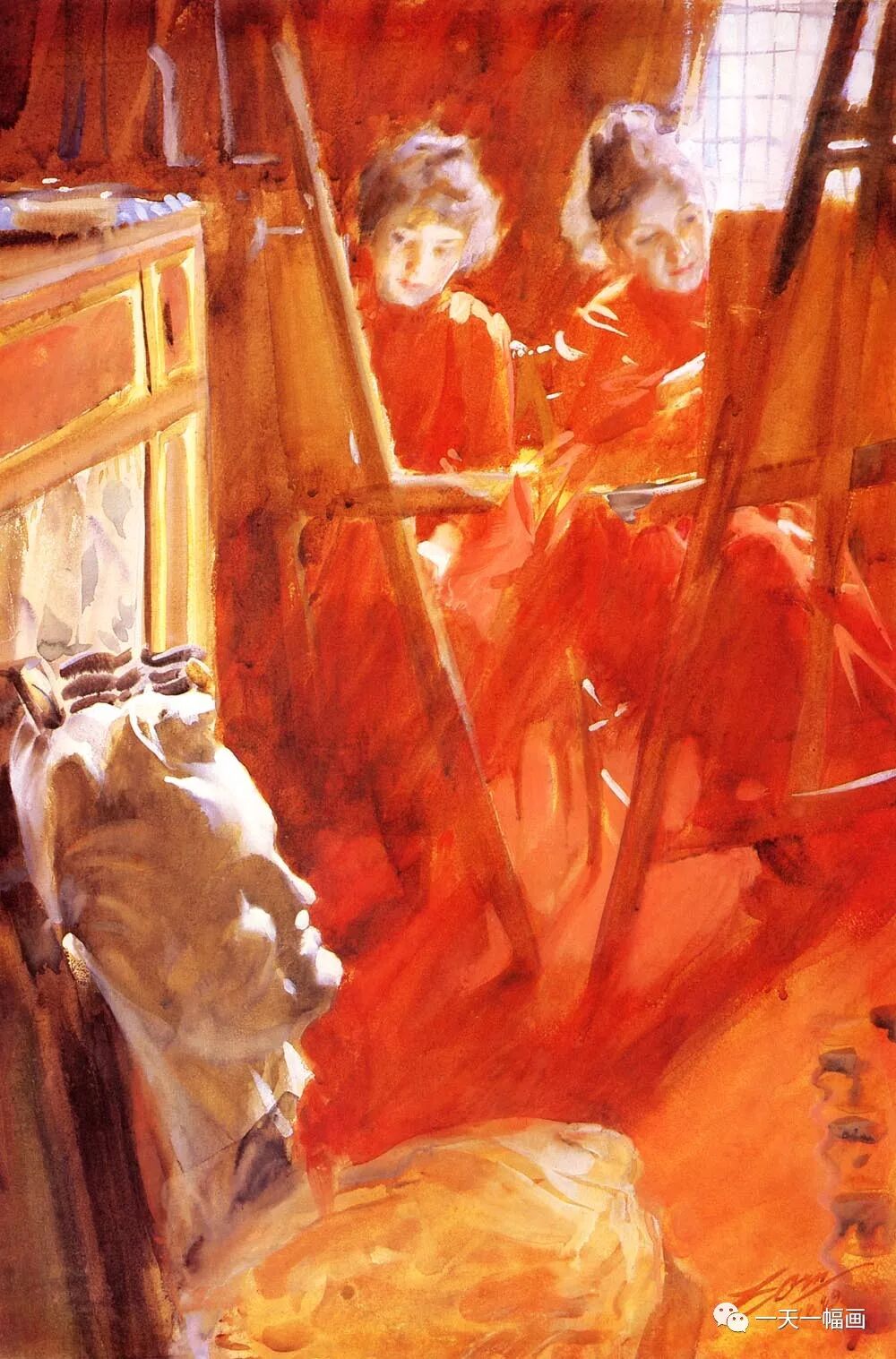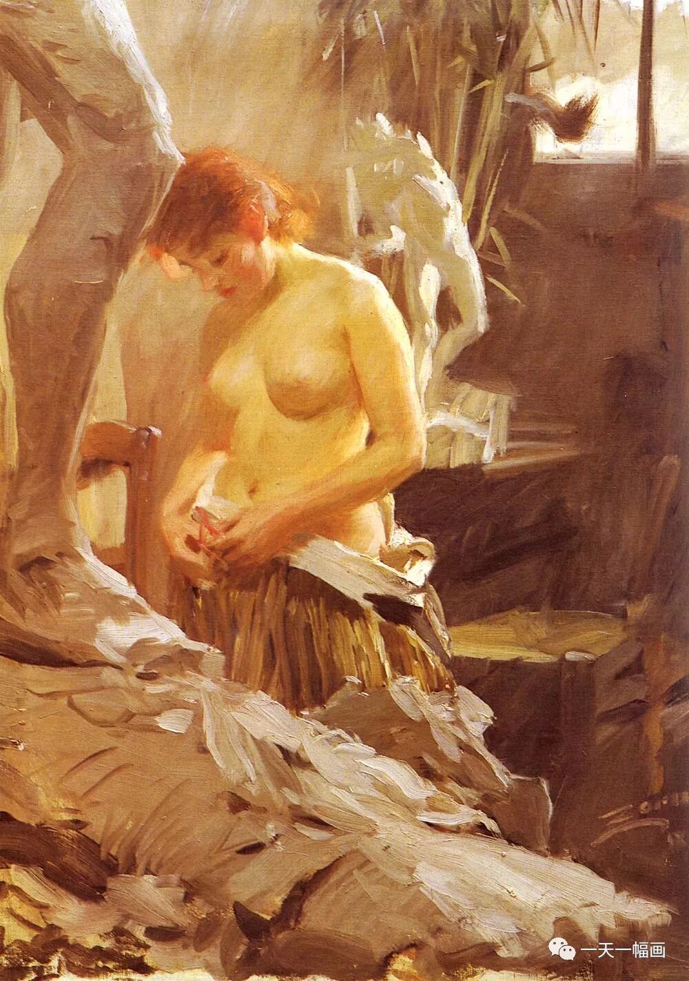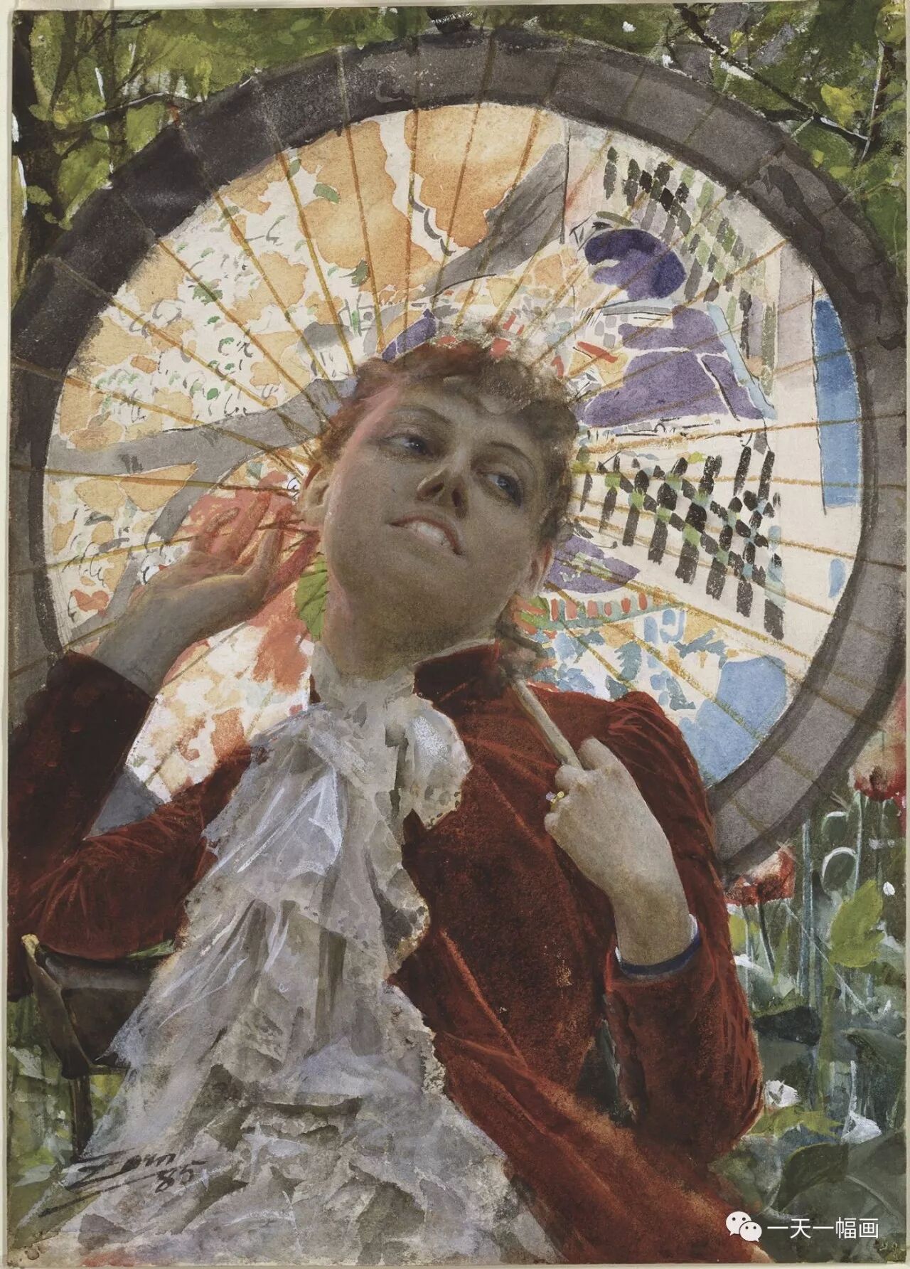 安德斯·佐恩(Anders Zorn,1860-1920)瑞典画家,还是一位蚀刻师、雕塑家。佐恩1860年生于瑞典莫拉的一个贫穷家庭,一直由外祖母照顾,母亲是名酿酒工。佐恩自幼酷爱绘画,尤其是水彩画才艺超群。1875年入斯德哥尔摩皇家美术学院学习,毕业后曾到英国、西班牙、意大利、法国及巴尔干半岛等地旅行写生创作,其间在巴黎和伦敦逗留期间受到印象主义绘画的影响和启发,研究掌握了光色关系,渐成自己的风格。