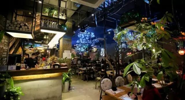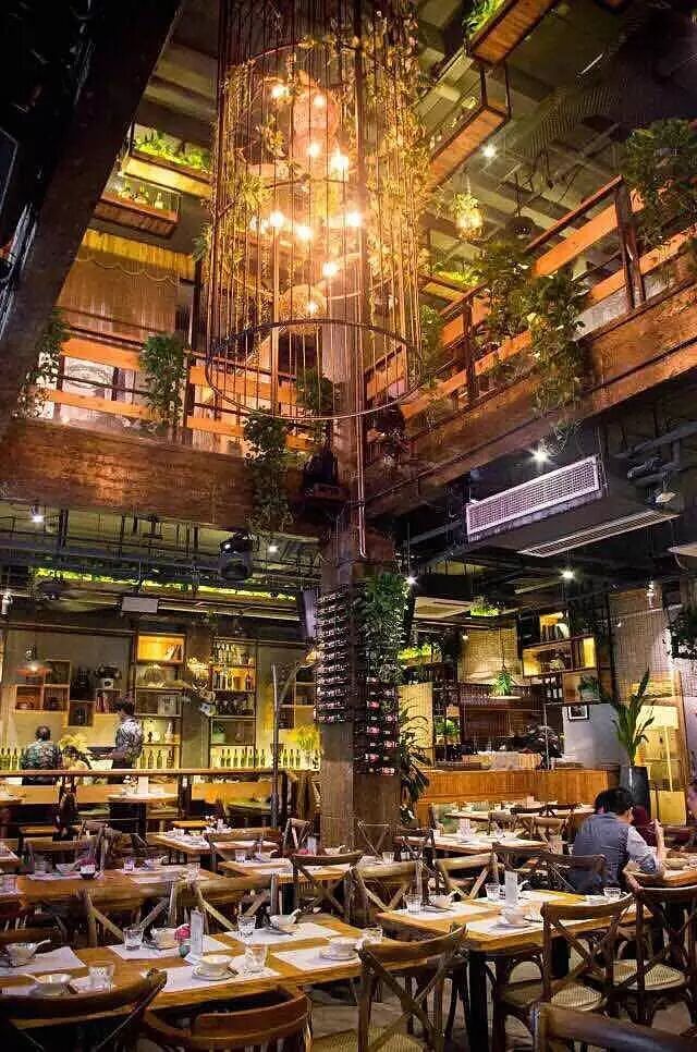 整个环境在粗犷的工业风中又不失温馨浪漫,就象在画中一样,到处都是绿色植物,好像爱丽丝梦游仙境。一楼中庭还有舞台和超大屏幕,每到夜晚,餐厅切换成清吧模式,会有驻唱歌手带来live show,或抒情,或摇滚~