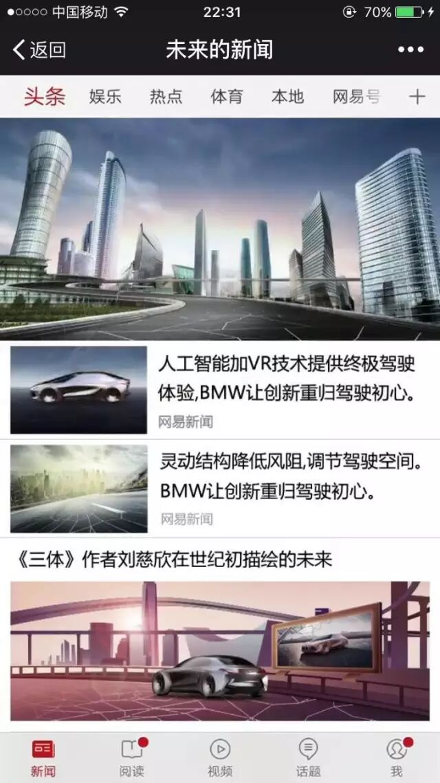 说未来的新闻前,先告诉你一个彩蛋,《三体》作者刘慈欣此次也参与了BMW和网易的合作中,你会在未来新闻的页面中,看到他描绘的未来场景,注意看,别错过!