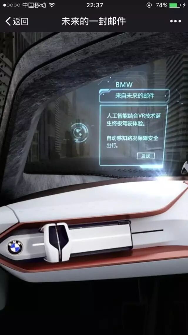首先你看到的是一封正常的邮件,TA在说未来BMW的新科技——人工智能,但这时邮件里出现了一辆车,文字开始发生变化,一个个行动的小人出现在车前。原来未来的邮件将会更直观的通过情境来描述,你看,这时画面中出现的就是BMW未来百年概念车的人工智能最好的解释,TA能够感知路况,提前预判。
