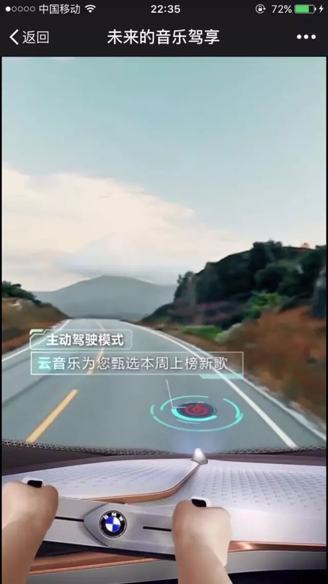 黑胶唱片的样式是网易云音乐的特点,但在BMW未来百年概念车里,你会发现黑胶唱片变成了AR技术的一部分,TA会出现在BMW的挡风玻璃上,成为车辆信息AR显示的一部分。