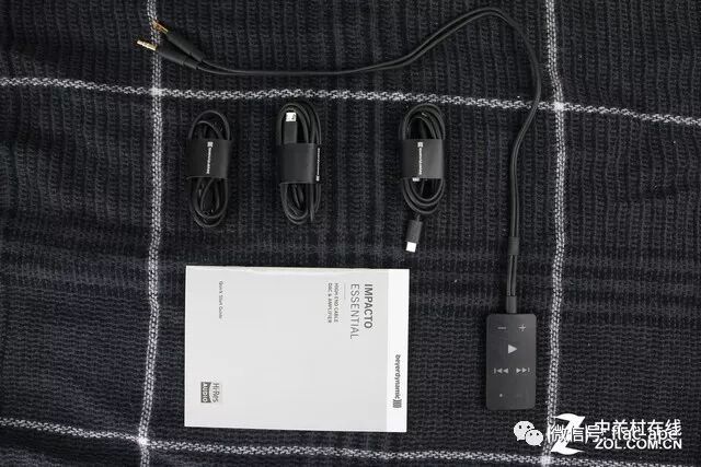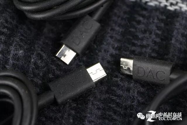 IMPACTO实际上是由三部分组成的:即适用于拜亚T5P MK2、T1 MK2、阿米罗等这些耳机的双3.5mm三段式耳机线、一个迷你解码耳放和一条USB数字耳机线。我们收到的这个IMPACTO版本是essential版,随机配三条数字线,一条是双micro USB接头线,一条是micro USB转USB TYPE-C线,还有一条是micro USB转USB TYPE-A线。据说非essential版还有micro USB转lightning接口的线。这三条线是有方向性的,连接迷你解码耳放那端的线柄上凸着“DAC”字样,表示这端接迷你解码耳放。