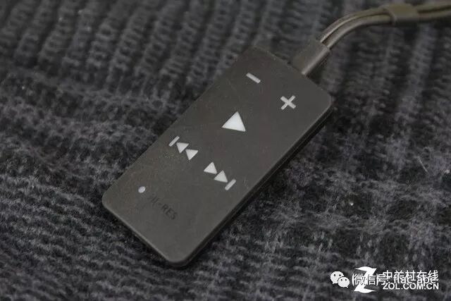 IMPACTO的外观没什么可介绍的,主要说一下迷你解码耳放部分。这是一个非常小的装置,整体大小跟四片摞起来的口香糖差不多,外壳是塑料材质,正面涂了类肤质涂层,从上到下设置了音量加减、播放/暂停、上一曲和下一曲5个按键以及一个Hi-Res指示灯,播放/暂停按键带白色背光。背面则是机器信息;还有两个金属触点,不知道有什么用。