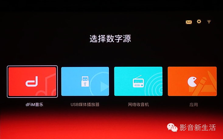 睿妙作为鼎梵一款全新概念的音响产品,在界面设置和功能操作上卯足了功夫,力求让用户轻松地掌握这款产品的使用方法,并快捷地进行视听娱乐。睿妙高保真数字唱片播放机拥有清晰的操作界面,让我们对产品的功能一目了然,4个不同颜色的长方形图标,代表着睿妙四个主要的功能,分别是dFiM音乐、USB媒体播放机、网络收音机和应用。