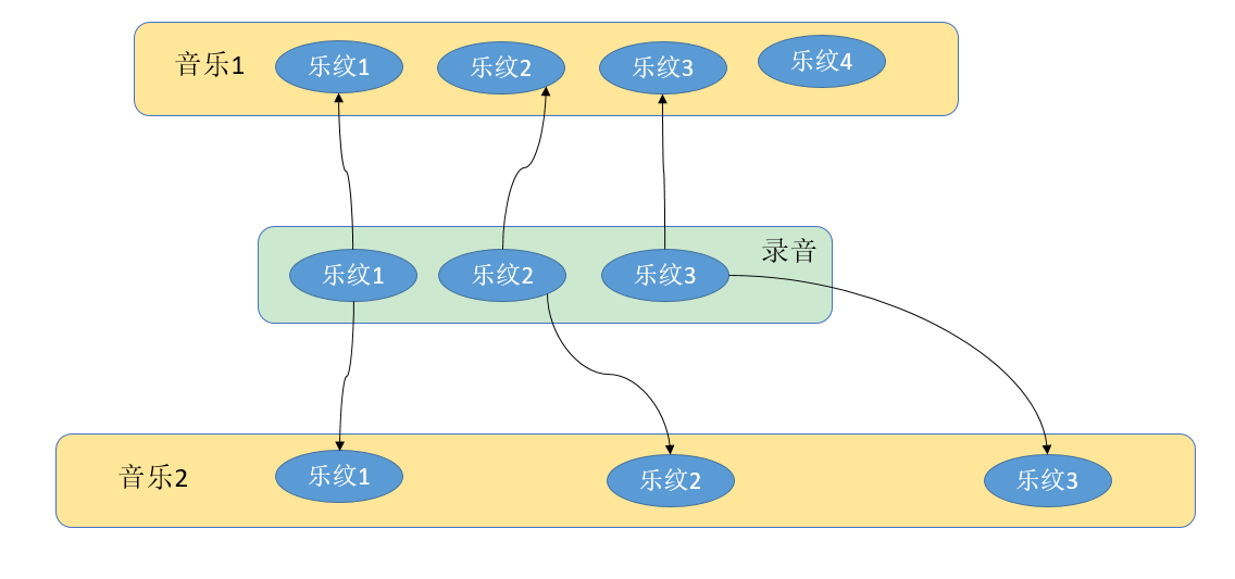 没错,和搜索引擎一样的做法,我们前面讲过倒排索引,你可以去看一下。有一点不同就是,假如一段录音匹配到了两首音乐,也就是说,录音的乐纹,在这两首歌中都有,如何评价谁更相似呢?其实很简单,我们当然希望最佳答案不光能匹配到录音的所有乐纹,而且希望它匹配到的乐纹的先后顺序,时间间隔等等,和录音里是一样的才行。就像下面的图片,虽然音乐1和音乐2里都有录音的乐纹,但是,音乐1的乐纹排列和录音的乐纹排列集合几乎是一模一样的,所以考虑录音是出自音乐1的。