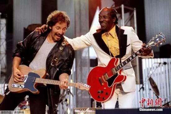 1995年9月2日,查克·贝里(右)与布鲁斯·斯普林斯汀(左)同台演出。查克·贝里的吉他演奏方式和创作风格直接定义了摇滚乐,摇滚舞台上后来被频繁模仿的经典“鸭子步”也是由查克·贝里所发明。
