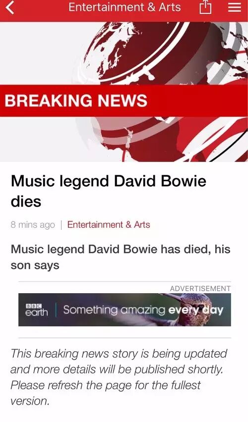 北京时间1月11日下午,David Bowie(大卫·鲍伊)发言人在facebook发布声明:David Bowie因癌症去世,他已与病魔抗争18个月。