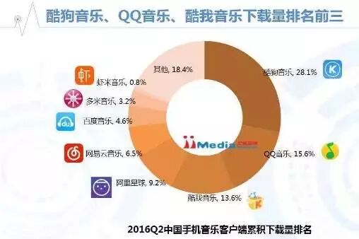 据艾瑞咨询2016年Q2数据,百度音乐的中国手机客户端积累下载量占4.6%,仅次于酷狗音乐、QQ音乐、酷我音乐、阿里星球以及网易云音乐。