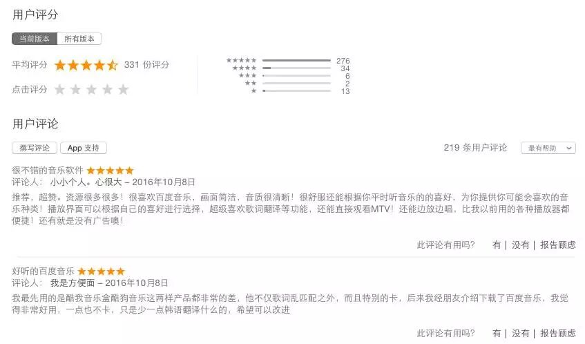 从产品最新5.9.0版本的用户评价来看,日前总共收到了331份评分,其中276份为五星好评,好评关键词包括“资源多、清新脱俗、音质好”等。