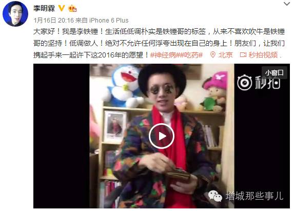 李明霖自称李铁锤,原因小编不是很清楚。除了李铁锤,还有才子锤、广告锤、神告锤、弹唱锤、遵守秩序锤、信念锤、国际锤、动物锤、rap锤......神烦!