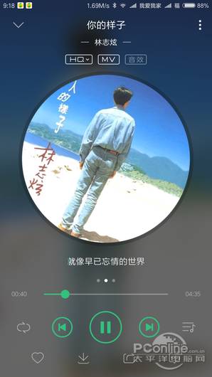 QQ音乐的播放器界面默认采用了转盘形式,转盘图案为歌曲封面+广告轮换模式。在播放器界面可进行音质、音效切换,进入MV模式。向右滑可查看歌曲详细信息,向左滑可查看歌词。下方一栏控制按钮有播放循环模式、上一首下一首暂停、歌曲列表、添加喜欢、下载歌曲、分享歌曲、评论歌曲这些按钮。
