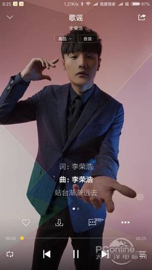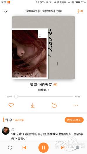 虾米音乐的播放器界面采用了海报模式,大大的唱片海报展示出来。点击海报可切换到歌词显示模式。没有直接的音质切换按钮,需要在菜单寻找。拥有寻找类是歌曲按钮、添加喜欢、下载歌曲、分享歌曲、功能菜单按钮。评论区域直接上滑显示,下方一栏控制按钮有删除、上一首下一首暂停、歌曲目录。循环模式按钮被隐藏在了歌曲目录中。