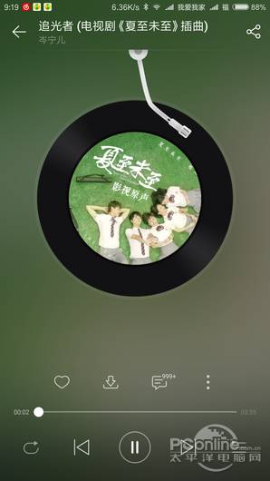 网易云音乐的播放器界面默认采用了转盘形式,不过加入了唱针的设计看起来就像唱片机,而且唱针是可以拨动的。在播放器界面。点击转盘可切换到歌词显示模式。没有直接的音质切换按钮,需要在菜单寻找。下方一栏控制按钮有添加喜欢、下载歌曲、歌曲评论(那些让人看哭的评论就是在这里来的)功能菜单按钮、循环模式、上一首下一首暂停、歌曲目录。
