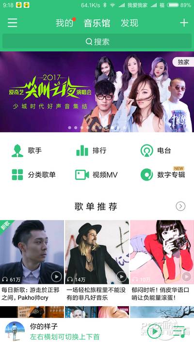 QQ音乐的主界面默认采用了绿色风格,视乎在提醒用户绿钻的存在。主界面被分为了三大区域(功能分类、内容显示、迷你播放控制条)。