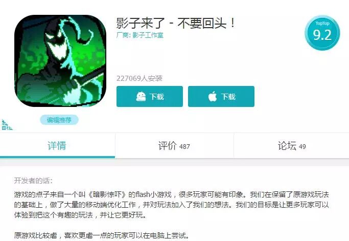 如果你不能像《紫》《I and me》和《暗影逃生》的开发者一样,对程序、美术、音乐大部分功能开发工作都能一个人跑完全场,还是得组个团队一起开发。有些是相识多年的合作伙伴如《呆呆大冒险》、《影子来了》制作团队,有些则是通过志趣相投而在一起的如《冷鲜肉》、《启蒙》制作团队,甚至有些是公司内部开发独立向产品如《死神来了》、《你胖你先吃》。