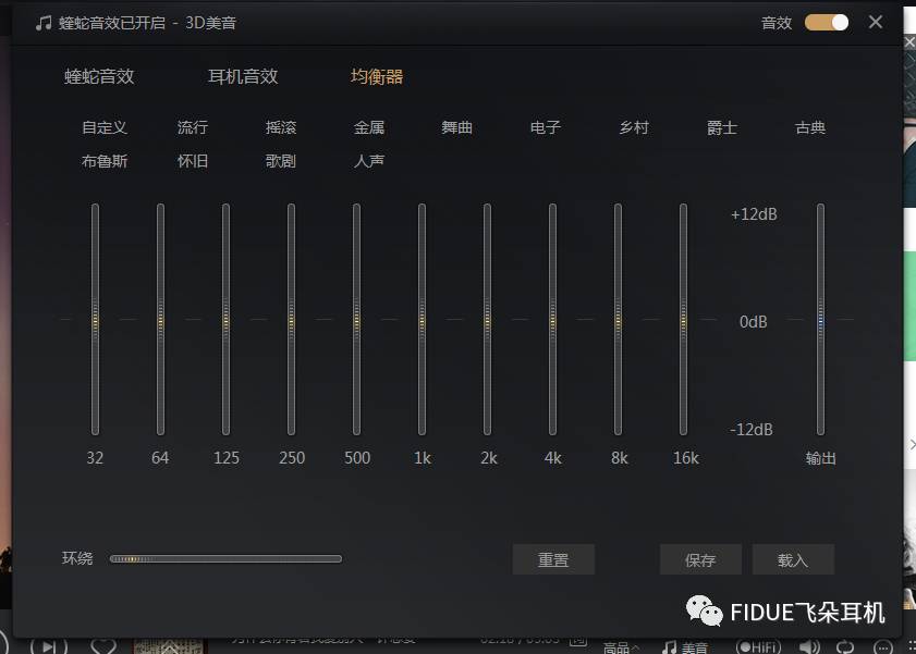当然,如果你在使用耳机,但对酷我预设的耳机音效并不满意,又或者并没有你所用的耳机的话,在“均衡器”页卡中,还能够加载各种预设均衡器,甚至针对自己的耳机和口味,进行均衡器调整。和QQ音乐的均衡器调整相比,除了能够调节频段和选择环绕感之外,用户还能够对设置好的均衡器方案进行保存,在收听特定的音乐的时候再调用。不得不说酷我音乐对音效使用场景、模式和可玩性的挖掘,在这三款软件里面做得相当深入。