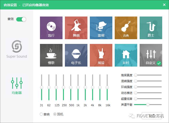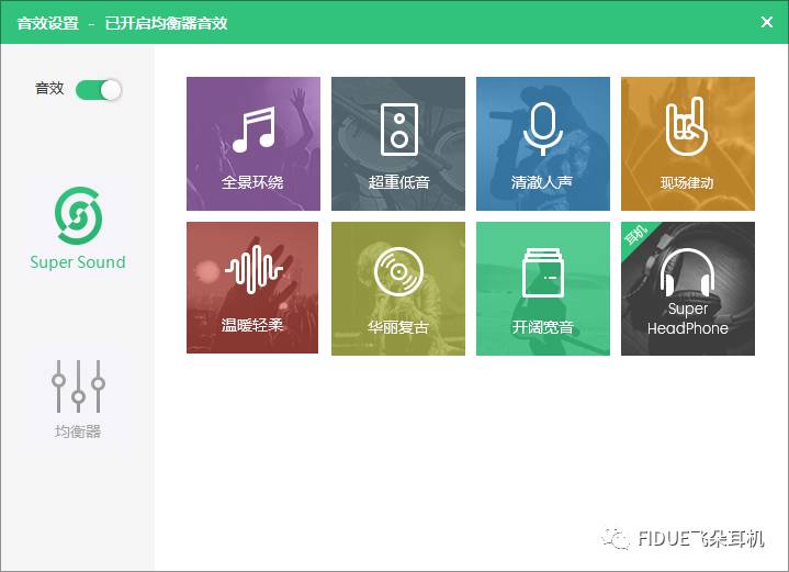 点击页卡最末的“更多音效选项”,在弹出来的新页面中就能看到SUPER SOUND全八种音效,其中,小娘君觉得“开阔宽音”这个选项看着很迷,点进去之后发现原来是低音增强和虚拟声场的打开。至于效果如何?小娘君还是宁愿用均衡器自行调校。
