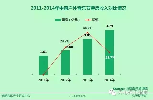 投资圈的看好,跟市场需求、消费习惯的改变有极大关系。国内消费者在音乐领域的花销和投入飞速增长,根据中国演出行业协会发布的《2015中国演出市场年度报告》显示,2015年大型演唱会、音乐节演出0.19万场,比2014年上升35.71%。演出衍生品及赞助收入29.24亿元,上升11.01%,单音乐节衍生品及其他收入3.58亿元,比2014年整体上升32%。