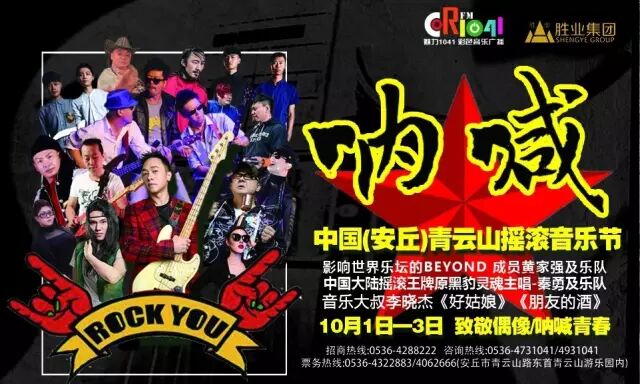 10月1日下午15:00,由安丘电台1041彩色音乐调频主办,山东胜业集团、上海怡豪文化传播有限公司、青云山民俗游乐园共同承办的《2016青云山“呐喊”摇滚音乐节》,在青云山滑雪场正式拉开帷幕,开启连续三天的音乐狂欢盛宴!