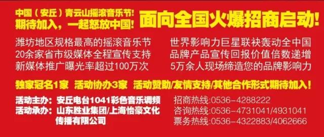 “呐喊”摇滚音乐节,用摇滚释放青春,用摇滚呐喊激情,仅仅靠耳机里传出的乐音是绝不足以释放摇滚所迸发的能量和激情的,这是一个“噪”的演出现场,震撼现场的声浪、兴奋剂般的渲染和噪音中狂舞的人群将会沸腾安丘,沸腾青云山。