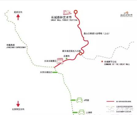 北京市区至艺术节现场:从京藏高速入口(清河收费站)行驶到水关长城出口,沿交通指示牌穿过水关长城入口和石佛寺村,进入长城森林艺术节北停车场。
