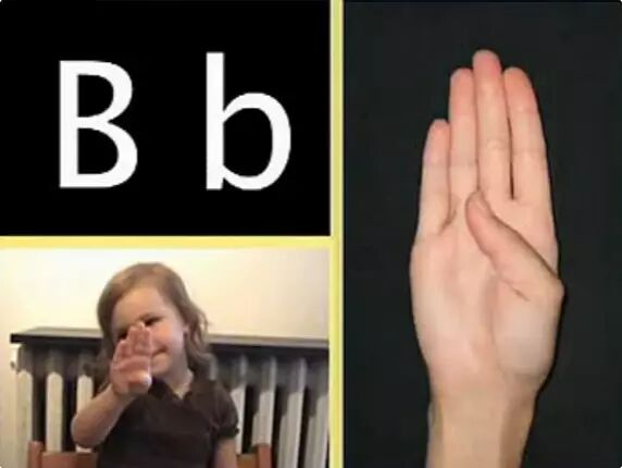 字母b :朝天指出四个指头,这次掌心朝外哦!