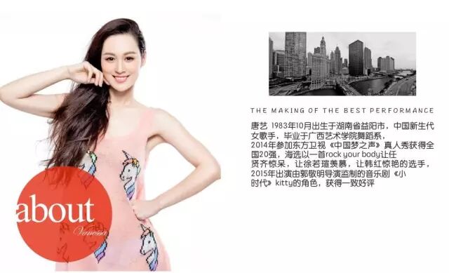 唐艺的热歌辣舞是她一直以来执着追求而又渐臻佳境的个人本色。“用心跳舞,用心演唱,我一定会让大家感受到我内心的那份执着。”唐艺誓在现场将大家带入音乐的海洋。在现场,你一定会被她强大的感染力折服,为之深深着迷。