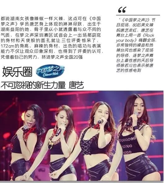 看过《中国梦之声》的观众一定对唐艺表现印象深刻,从深圳赛区试音会三位评审老师一直通过加入梦想班,到“美少女”战士的组合惊艳全场,每一个细节都能够看出唐艺的努力。俗话说“台上一分钟,台下十年功”,从2004年到2014年这位有梦想的女孩追逐了10年,她用自己的10年的沉淀和积累让观众眼前一亮,让评委都为此惊叹。