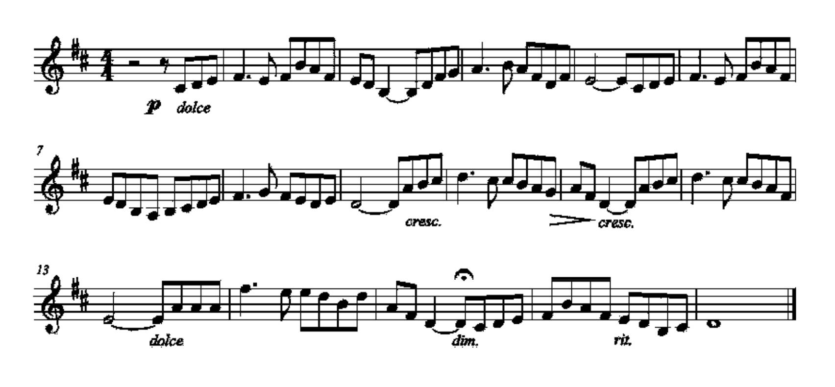 结合作品中所规定的表情术语,再运用上述对强弱的处理方法,对该条单声部旋律视唱的处理就基本完成了。 通过以上的训练,学习者会对一般的表情记号有较为成熟的认识,可以迈向下一个阶段——对于广义音乐表情的处理。