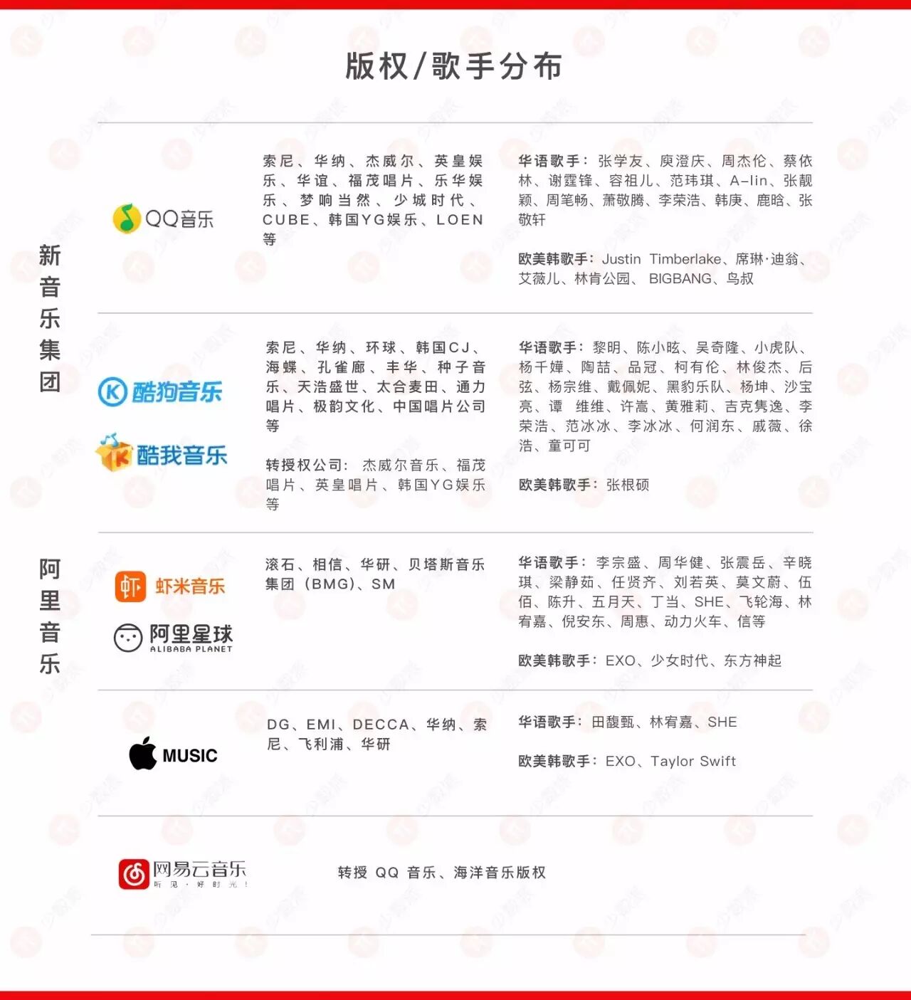 韩文歌的分布在各平台来说还是相对平均的,只是某几家公司、艺人和某平台签署了独家版权。比如 EXO 的部分专辑只能在阿里音乐和 Apple Music 听到,BIGBANG 只能在中国新音乐集团(QQ音乐、酷狗音乐、酷我音乐)和网易云音乐听到。