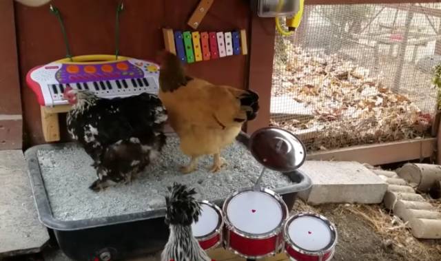 如上图所示,Jokgu平常在鸡窝时就有接触各种乐器,像是钢琴、木琴及鼓,在窝里的时候就时常有机会接触到这些乐器,其他的乐团成员不定,但是只有Jokgu被抓去弹美国爱国歌曲,可见牠在音乐上是有慧根的,可爱、完美地完成演奏。