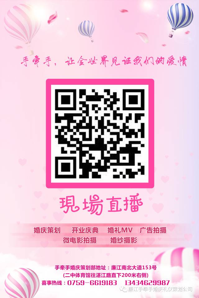 廉江市手牵手婚庆礼仪策划是廉江婚庆行业知名品牌、廉江婚庆行业示范单位、廉江婚庆行业领军企业、浪漫婚礼策划专家,是湛江地区唯一一间拥有超清电视LED屏(清析度P3)的婚庆公司。廉江手牵手婚庆于2014年投资一百多万购买电视屏,配合酒店T台秀。产品包括:浓情婚纱摄影、甜蜜回忆MV、唯美婚礼MV;打造不一样元素,你的婚礼你做主,完美体现于每一细节,浪漫主题任你选,活动期间,优惠多多 。