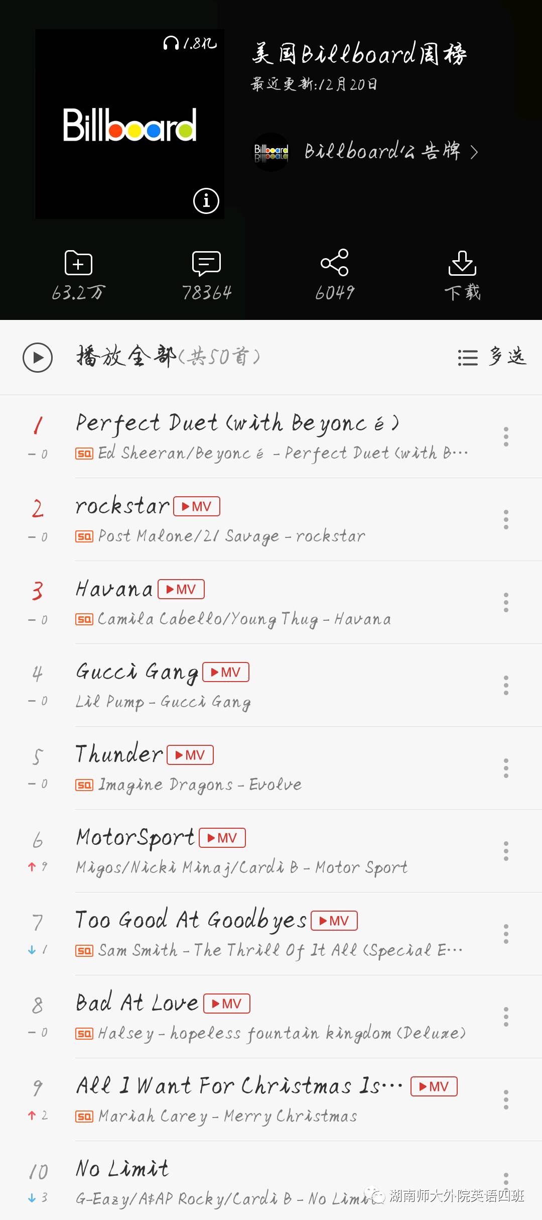 上周排名第三的Ed Sheeran 的 Perfect,在这周以与Beyoncé合作的duet(n.对唱)的形式登顶。