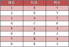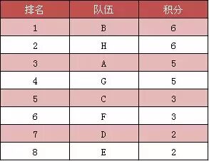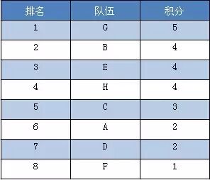 举例:第一轮比赛G队第一,BEH队第二,C队第三,AD队第四,F队第五