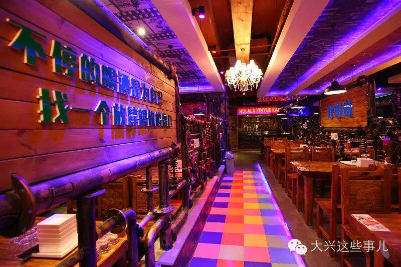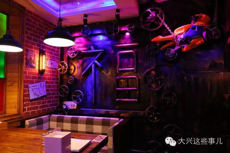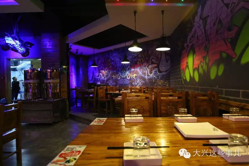 呼啦啦音乐烤吧除了对食材、味道讲究以外,室内的装修风格也一点儿都没有因为是家串吧而显得简陋。相反,这里的风格还真是花费了老板一番心血。