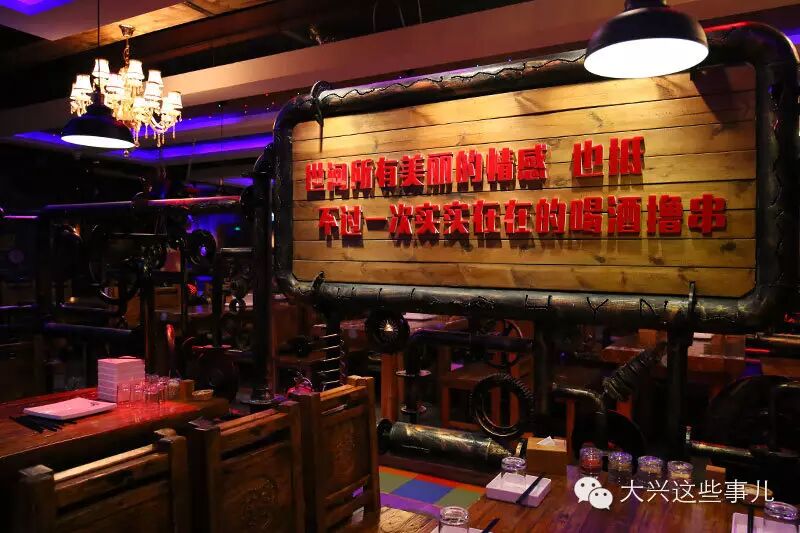 这家串吧占地600平米左右,整体布置成了重金属摇滚风格,将废旧的铜管打造成各式各样的造型,整体宛如一间旧厂房,放荡不羁的风格中还透着一丝小文艺。由于是音乐烤吧,这里自然少不了驻场乐队,每天晚上来这里用餐都可以看到有歌手现场演唱。这样的环境非常适合年轻人聚在一起吃饭、聊天。